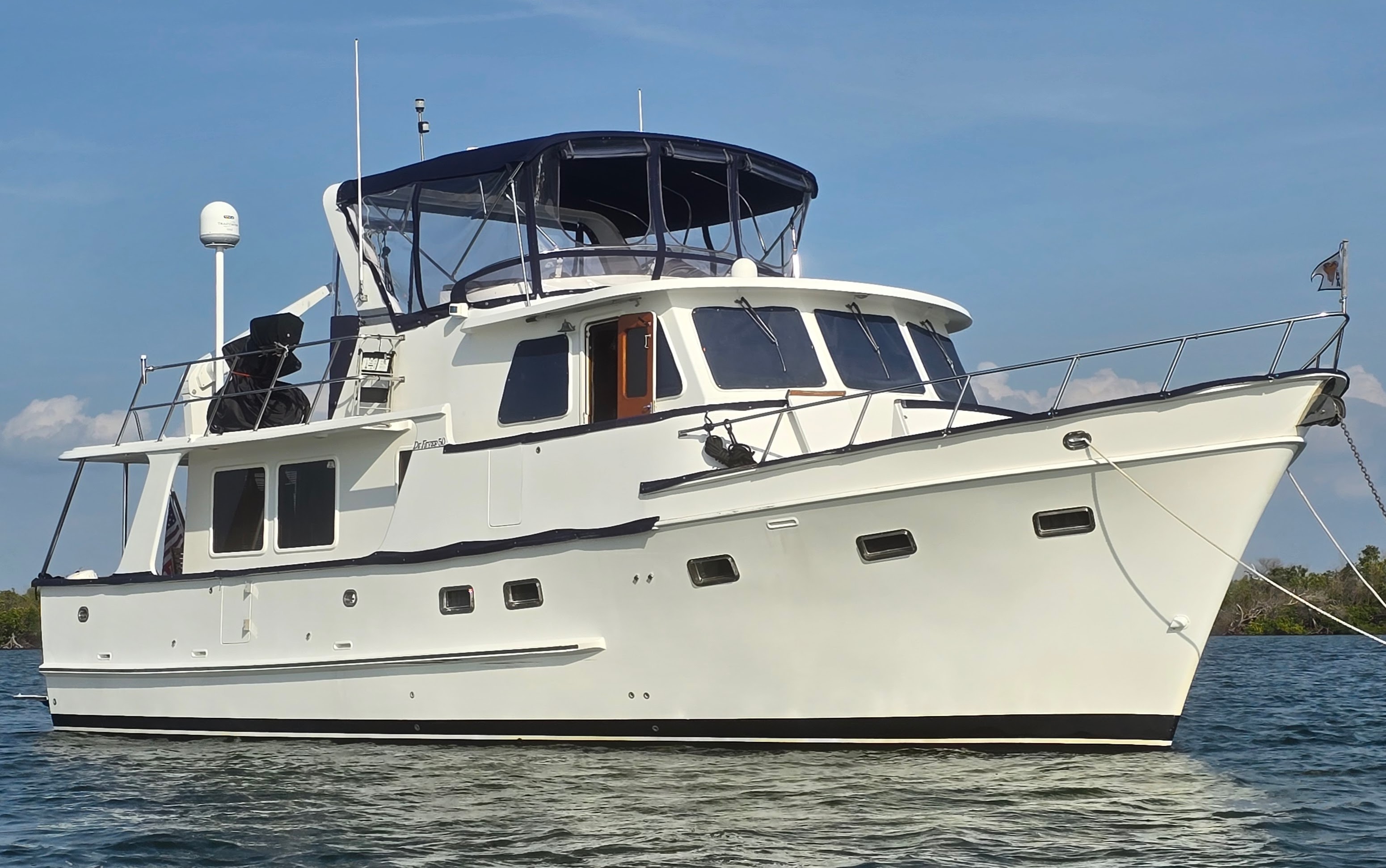 The updated design of the 49 cockpit model is now 50’- 10” overall with a full 16’ beam and 4’-6” draft. Solid hull, semi-displacement design with full keel and hard chine aft. Hull is factory built full length in the mold. Not believed to be in production at POCTA in 2019.